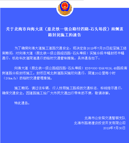 為了確保向海大道施工道路交通安全,現(xiàn)決定自2019年7月25日起至施工結(jié)束期間,對(duì)向海大道(原北鐵一級(jí)公路經(jīng)四路-石頭埠段)實(shí)施分段半幅封閉半幅通行,機(jī)動(dòng)車改道限速通行的臨時(shí)交通管制措施。具體通告如下: